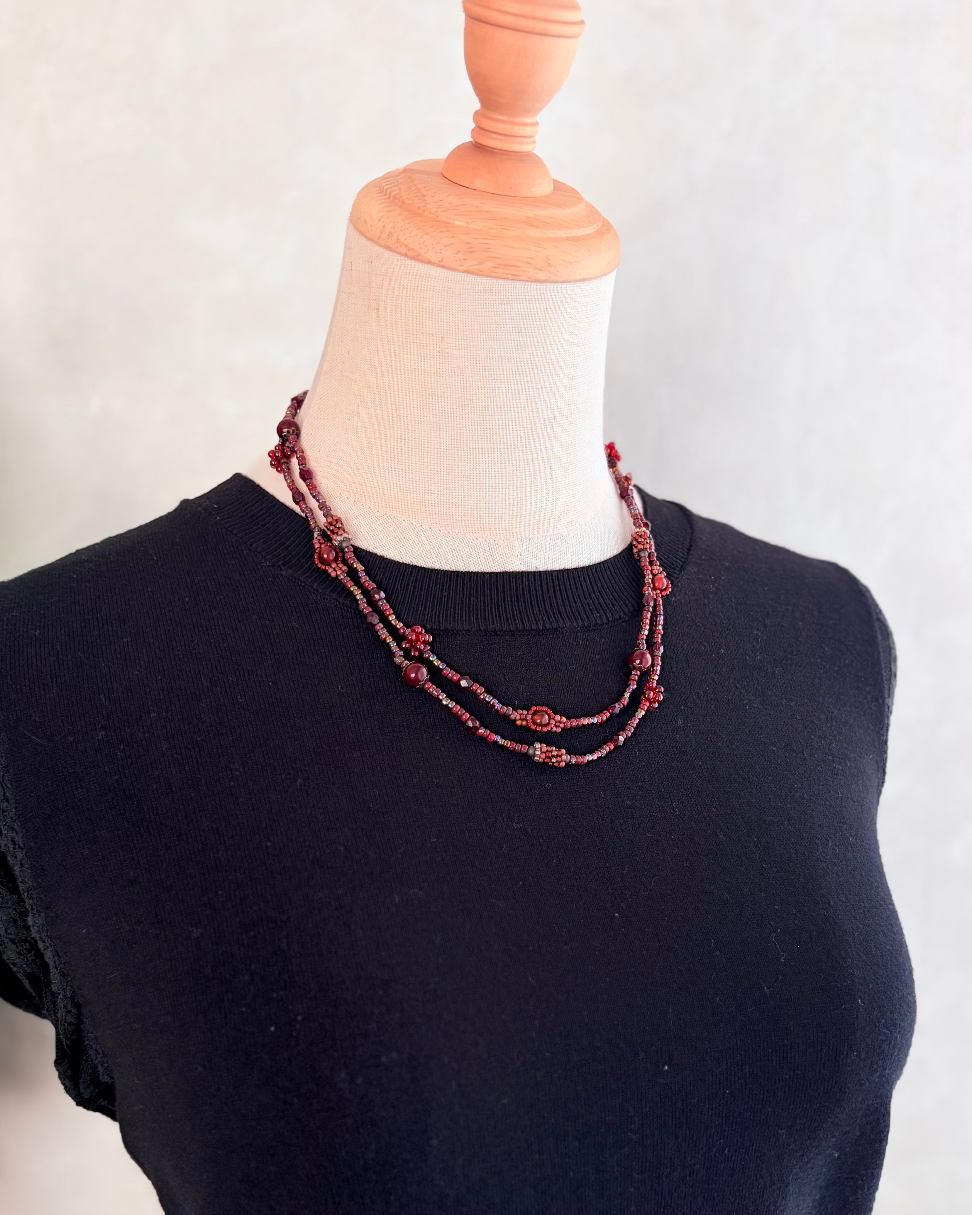 深みのあるレッドに様々なモチーフを入れたて繋げたロングネックレスです。長めのサイズなので結んだり、2連にしたり、2連にして捻ったりと色んな楽しみ方ができるネックレスです。