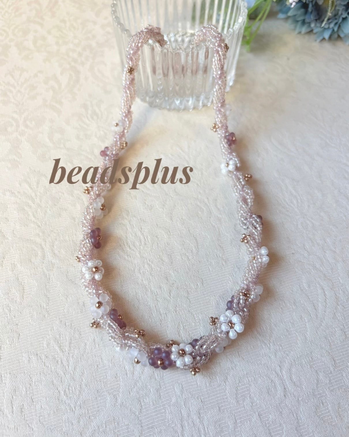 ピンクを基調にターンステッチやデージーフラワーでモチーフを編みながらスパイラルロープを編みます。アジャスター部分はペヨーテになります。
