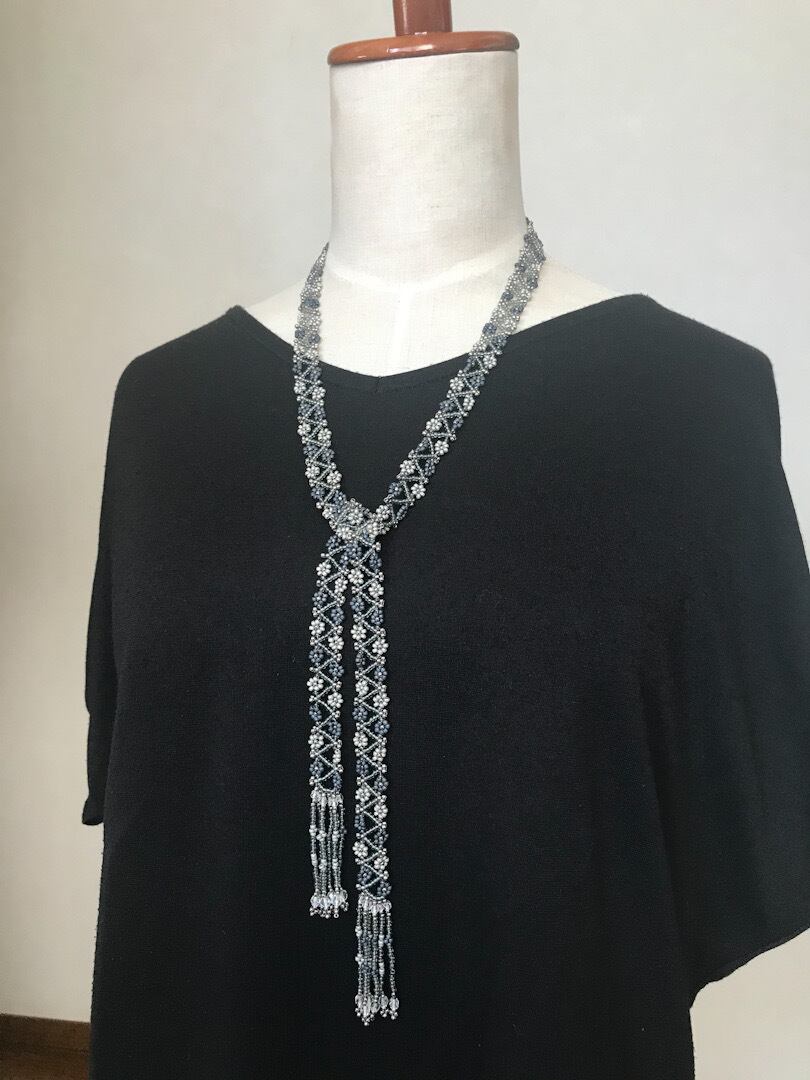 ブルーグレーとライトグレーの2色の花で構成されています。メリハリのある花の連なりが華やかに胸元を飾ります。