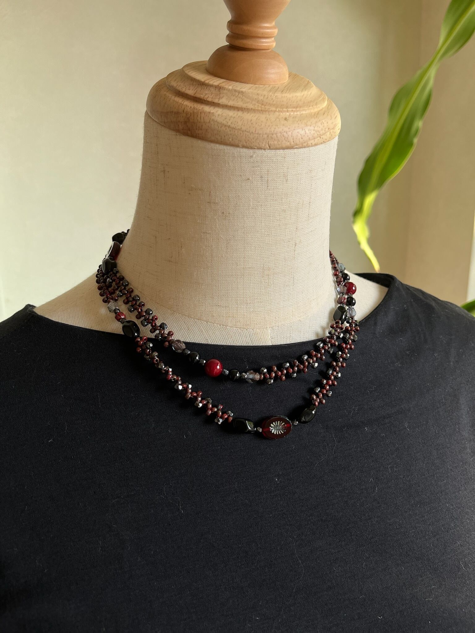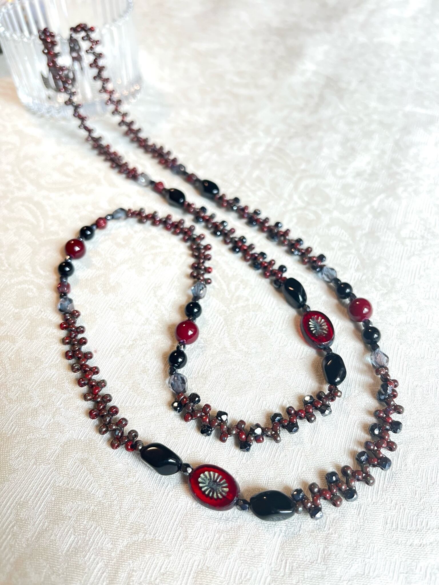 カラーは深いレッドのビーズを基調とし、ブラックやグレーのチェコビーズを
