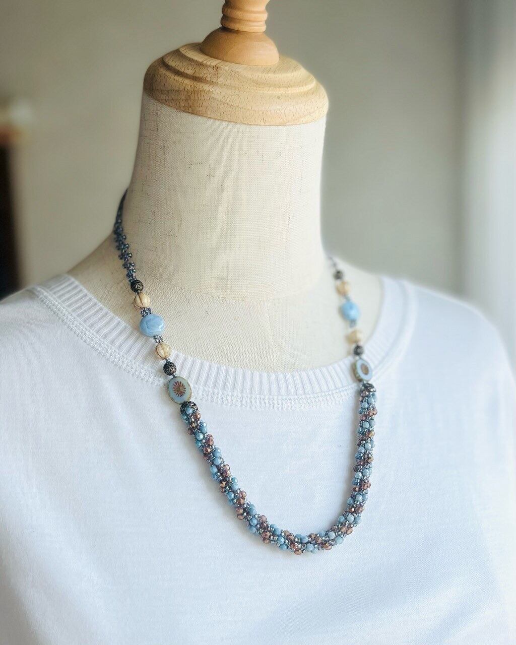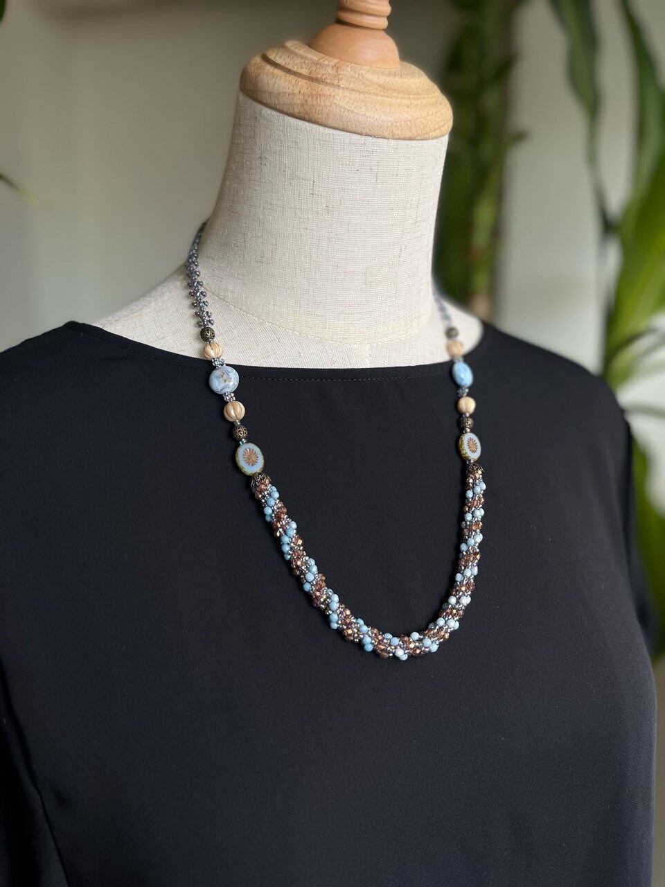 horizon blueと煌めくブラウンのビーズの2色が織りなす編地は上品な雰囲気を演出します。