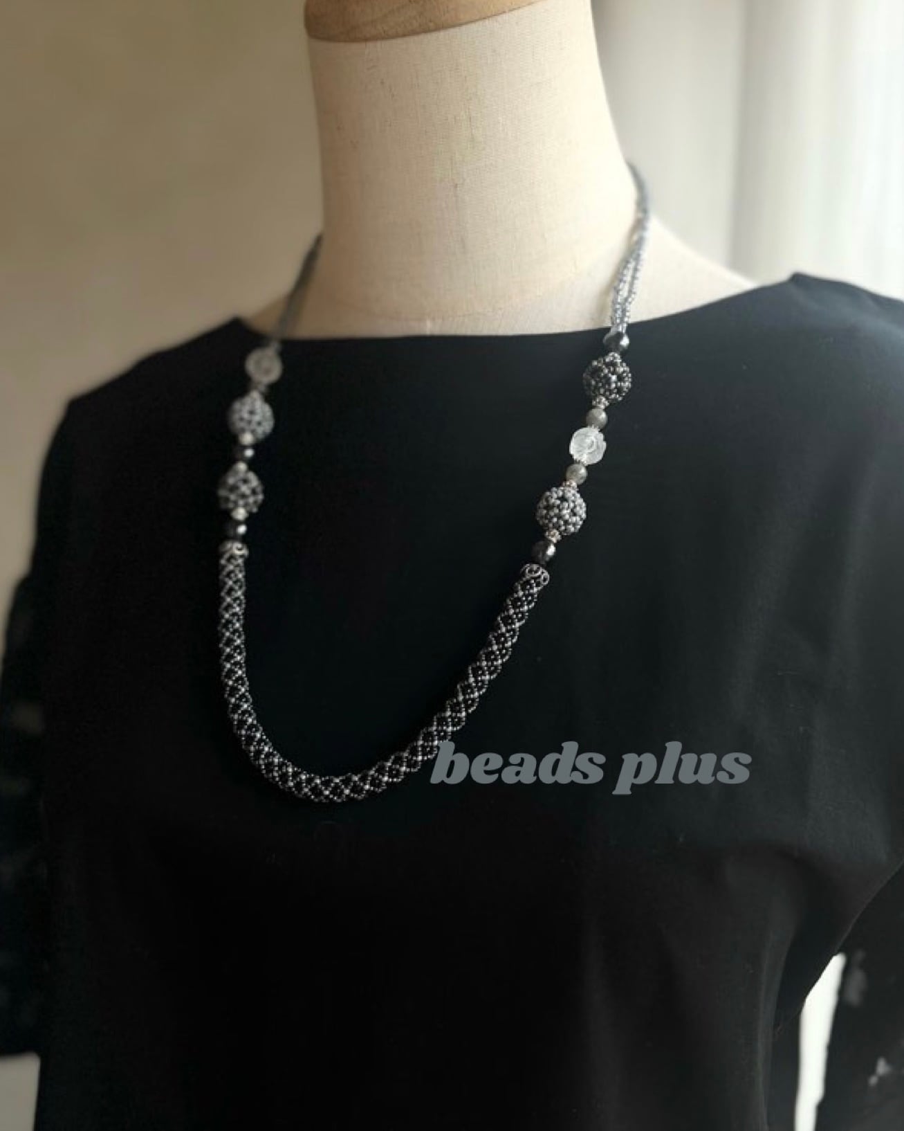 編み地はパールの入ったネッティングですが、ボリュームを抑えて8㎜の太さに仕上げています。ブラックのベースにグレーのラインが映える特小ビーズを使用した繊細さが美しいデザインです。