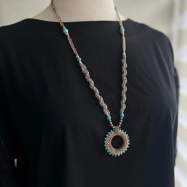 サークルのトップは大きさの違うビーズをグラデーションカラーでペヨーテで編みます。