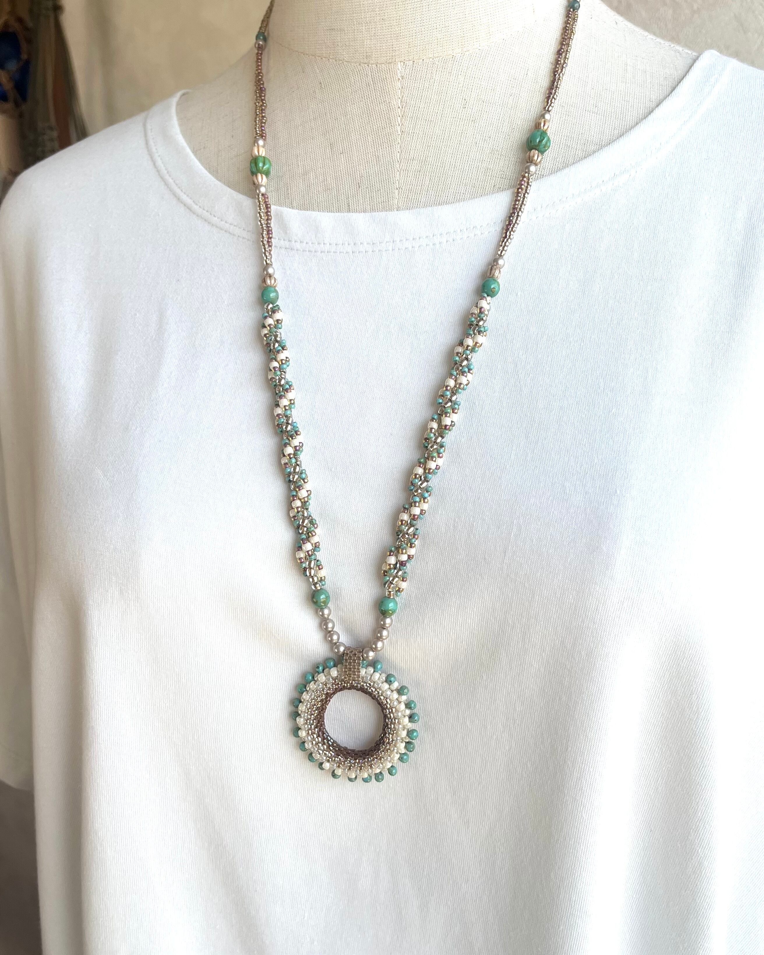 サークルのトップは大きさの違うビーズをグラデーションカラーでペヨーテで編みます。