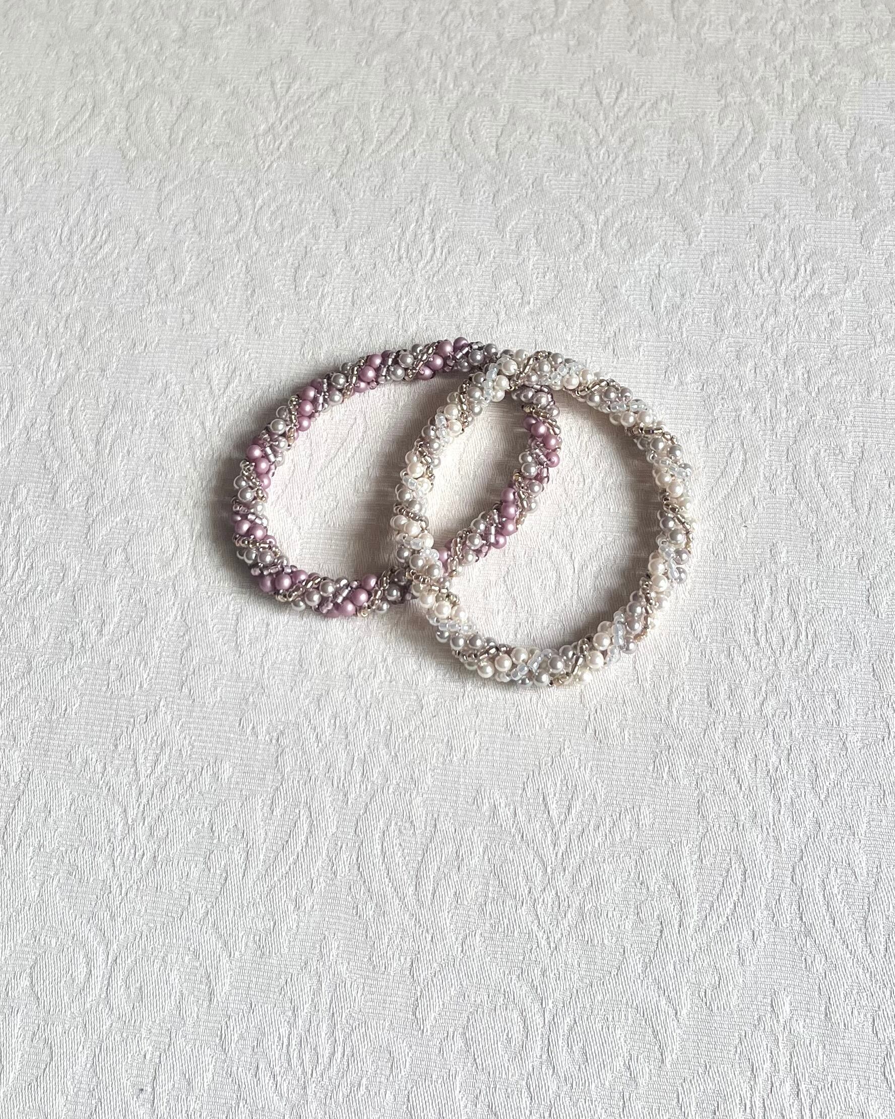 パールと丸小が織りなす、ピンクベージュ、ゴールド、オフホワイトの模様が綺麗なバングルです。